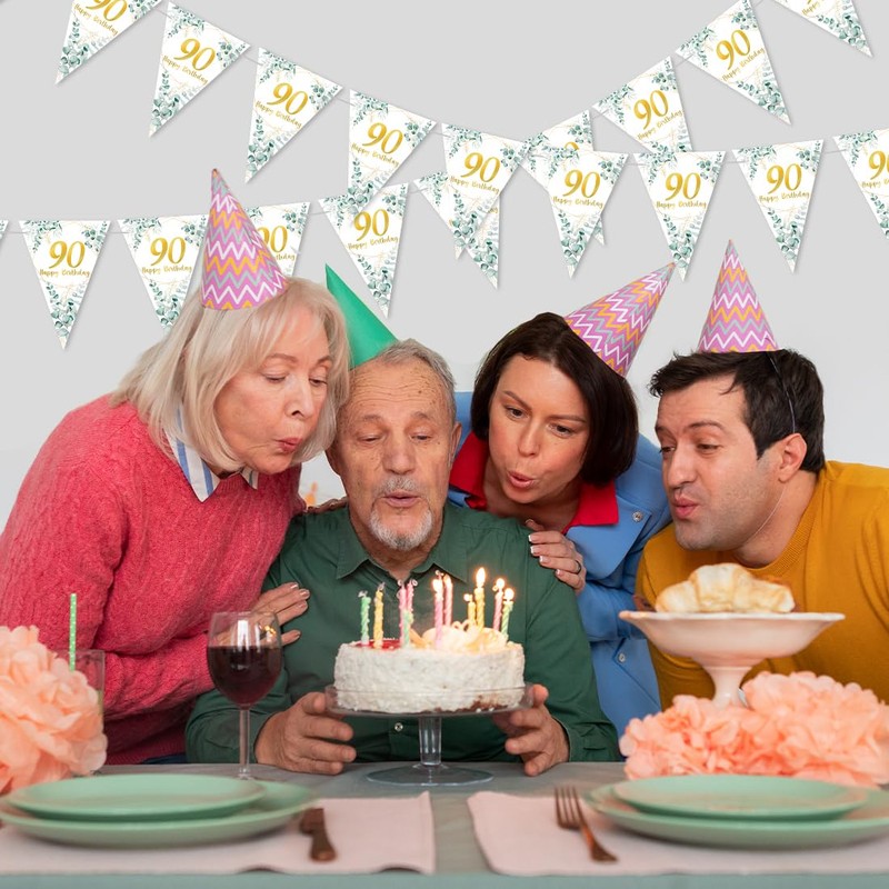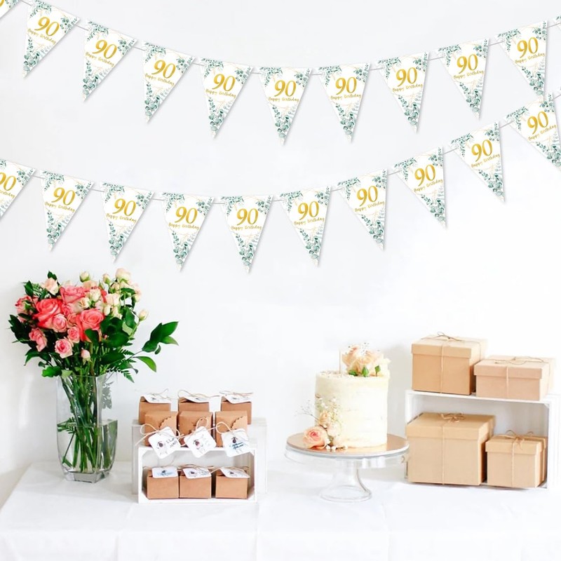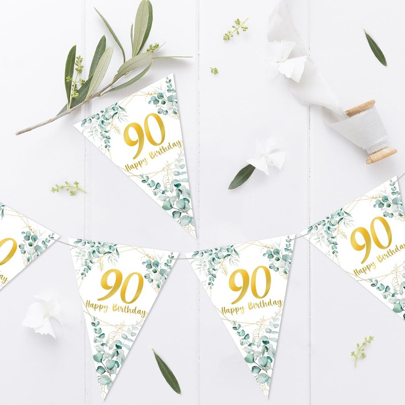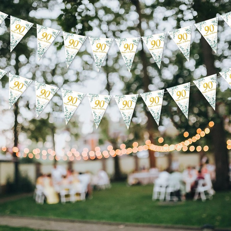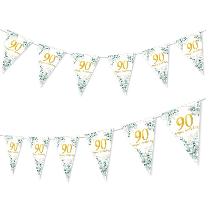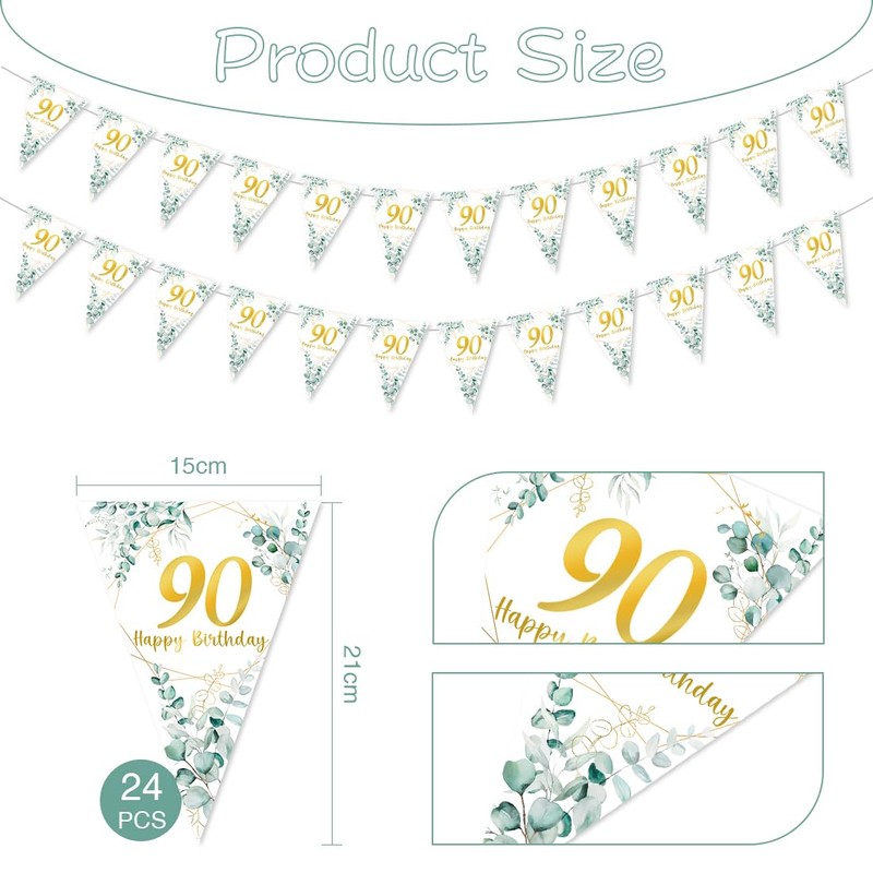 - The 90th birthday decoration set contains 2 x 90 years bunting green gold, each bunting contains 12 flags, each flag measures 15 x 21 cm.