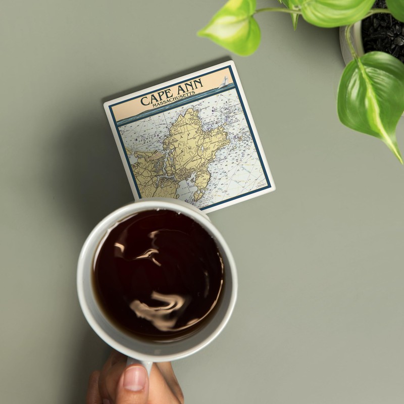 - Cape Ann, Massachusetts, Nautical Chart (Absorbent Ceramic Coaster, Single, Cork Back, Kitchen Table Decor), each coaster measures 4x4 inches.