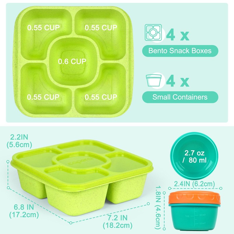 • WHAT YOU GET: 4-Pack 5-compartment bento snack containers with lids, 4pcs Leak-proof small food containers, and caring customer support. If you experience an issue with your product, get in touch with us for a satisfied solution.