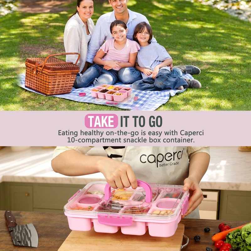 Caperci Original Snackle Box Container - 10-Compartment Divided Snack Serving Tray with Lid & Handle, 2 Dressing Containers, Leak-Proof, Dishwasher Safe, BPA-Free (Rose Pink)