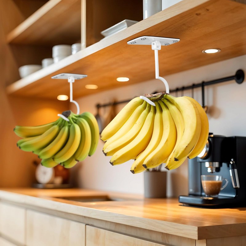 • WAYS TO KEEP BANANAS FRESH: The under cabinet banana hook can keep bananas hanging, giving them the illusion that they are still hanging from the tree. Expose bananas to natural airflow to promote even ripening; while avoiding contact with other fruits on the table and reducing skin bruising; thus maintaining the freshness of bananas