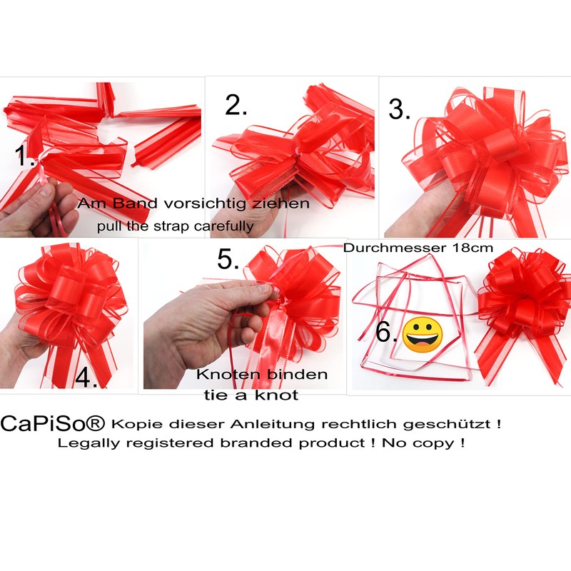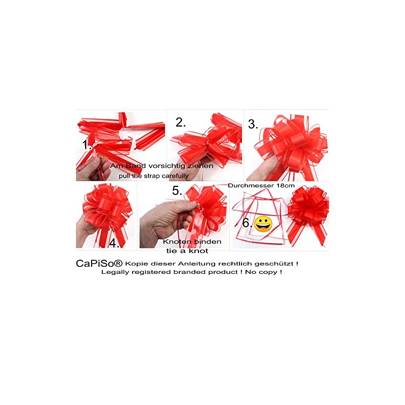 - Large pull bow with approx. 16-18 cm diameter for easy self-pulling. Very easy and easy. Pull at the bottom of the open band. Both bands simply and carefully knot. Pretty pluck. Done! See instructions