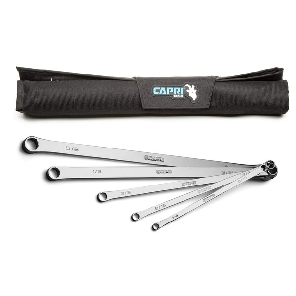 The Capri Tools 0 Degree Offset Extra Long Box End Wrenches are designed to let you easily tackle recessed bolts and bolts in tight spots. The thin-walled super thin box end with deep profile grabs firmly onto recessed bolts. 0 degree offset allows for a secure fit onto fasteners, giving your higher torque and easier swing. Extra long handles, up to 2x longer than standard wrenches, give you more leverage. The wrenches are constructed with premium Chrome Molybdenum steel to provide exceptional strength and durability. These box ends have 12-point WaveDrive which transfers torque uniformly and prevents damaging and rounding of the bolt. Finished with our flawless chrome plating, achieved by thorough polishing and careful application of chrome protective plating, it ensures durability and corrosion resistance. Large stamped sizing won't fade over time. Set completes with a heavy duty canvas pouch. 5-piece set with 8 sizes: 1/4 x 5/16 in., 5/16 x 3/8 in., 3/8 x 7/16 in., 1/2 x 9/16 in., 5/8 x 3/4 in.