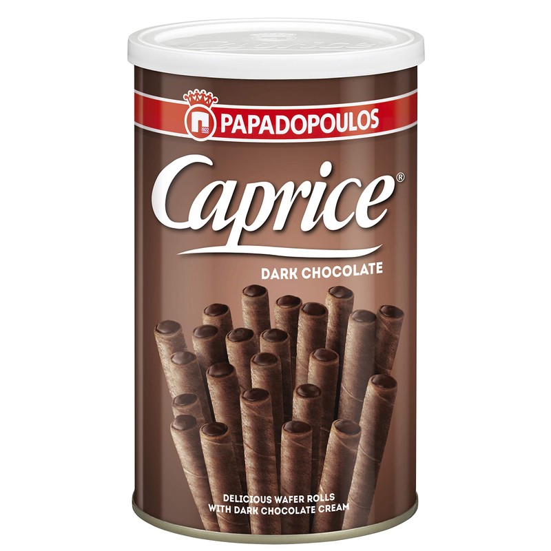- Caprice Dark Chocolate Wafers, 8.8 oz tin, cylindrical chocolate wafer filled with dark chocolate