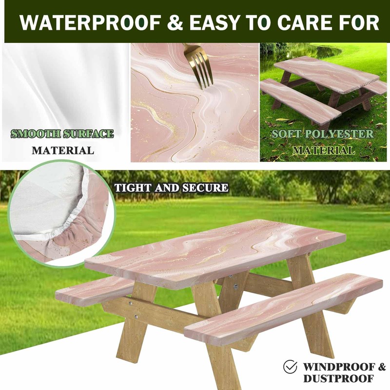 CAPSCEOLL Picnic Table Cover with Bench Covers Elastic Edges, Waterproof Camping Fitted Tablecloth with Drawstring Bag Camping Table Cover Pink Marble 72x30 Inch