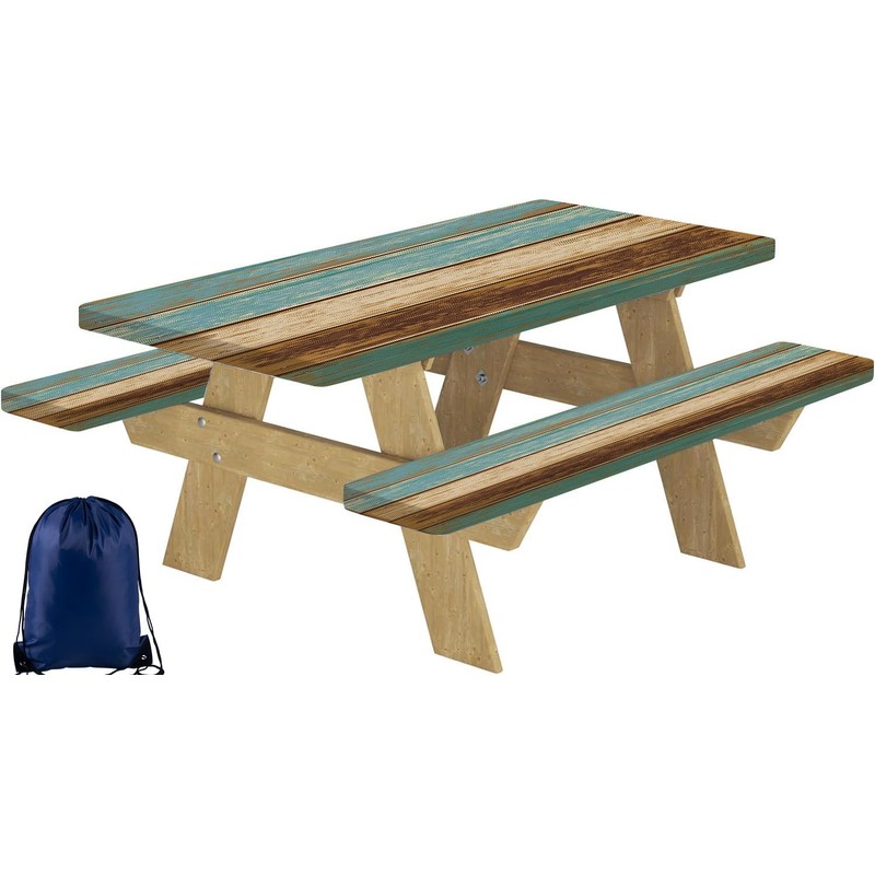 CAPSCEOLL Picnic Table Cover with Bench Covers Waterproof Camping Tablecloth All-Weather Outdoor Table Protector with Drawstring Bag for Camping Essentials, 72X30in, Blue Brown Wood