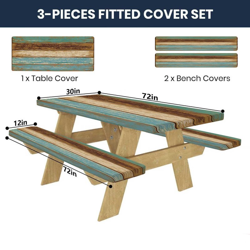 - [Complete Set with Storage Bag] This 3-piece picnic bench covers set includes 1 elastic picnic table cover (72x30in) and 2 matching bench covers (72x12in) complete with a convenient drawstring carrying bag. Perfectly sized for standard 6FT camping tables, ideal for outdoor picnics, RV trips, barbecues, and backyard gatherings.