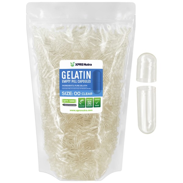 XPRS Nutra Size 00 Empty Capsules - 5000 Count Clear Empty Gelatin Capsules - Pills DIY Capsule Filling - Fillable Pill Gel Caps for Do It Yourself Supplements