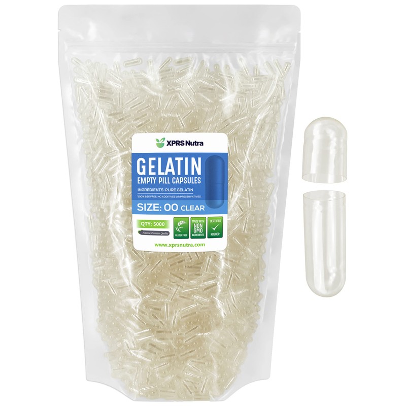 Premium Size 00 Empty Capsules Do you fill your own dietary supplements, nootropics, herbs or powders? Do you want to budget your money by buying top quality empty pill capsules in bulk? These XPRS Nutra (Capsules Express) easy-fill easy-snap lock size 00 pill capsules are perfect for DIY easy to swallow dietary pills capsules whether you fill them manually or with a capsule filler. Size 00 capsules hold 600 mg to 1100 mg of your desired powder or supplement. Because each powder, vitamin, or medicine has different grain sizes and weights, the total fill volume varies from ingredient to ingredient. Dissolves Rapidly Each pill capsules empty pill casing is made from 100 percent bovine gelatin without preservatives or additives. You can use a capsule filling machine or fill them manually They dissolve quickly in your GI tract for better absorption and greater bioavailability. Our capsules are clean and Kosher. They have no taste, fragrance or odor. Secure Click Safe Design Unlike many bovine based capsules, ours have a built in click shut design. That's important because it protects the contents of your pill from spilling out or getting damaged from moisture buildup or stale air contamination. Our capsules are colored to make manually filling as quick and easy as possible. We have a variety of empty gelatin capsules sizes including 000, 00, 0, 1, 2, 3, 4 and 5 in colors red, blue, green, orange, yellow, white, purple, pink and more. Bulk Savings Choose from either 100, 500, 1000 or 5000 individual vegetable or gelatin capsules and save more money the more gel caps you purchase at once. The 5000 count fillable gel capsules bag is the best bang for your buck! Join thousands of happy customers and up your health game.