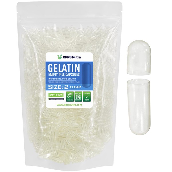 XPRS Nutra Size 2 Empty Capsules - 5000 Count Empty Gelatin Capsules - Clear Empty Pill Capsules - DIY Capsule Filling - Pure Bovine Pill Capsules Empty Gel Caps