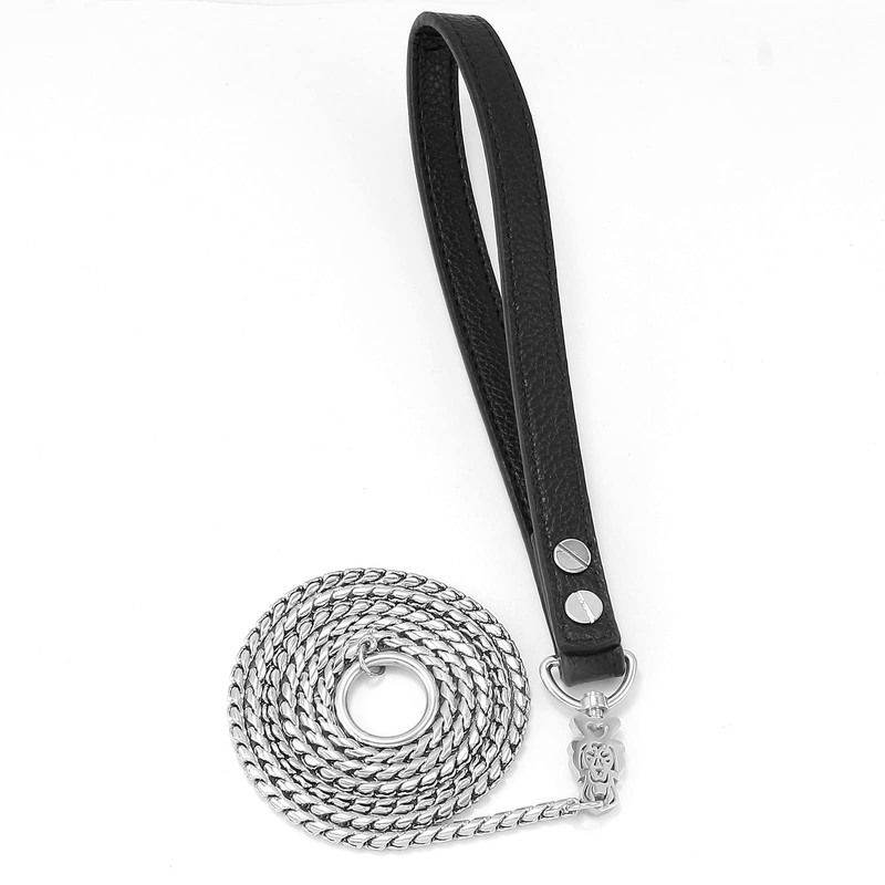 - 【What is this dog leash made of? ]: Made of 316L stainless steel chain with genuine leather handle, 18k gold plating. The chain has high strength, high hardness, heavy, durable, no rust, no discoloration, and is guaranteed to be used for many years! The locking ring locks and unlocks easily and is so strong that even 700 pounds of force can't pull it apart!