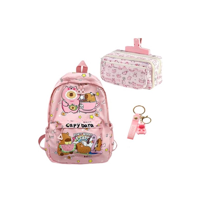 - 【Product Combination】This 3-piece Capybara themed set includes a pink backpack, a soft pink PVC Capybara keychain, and a unique 9-layer printed Capybara pencil case (17.3×6.8cm). The cute animal design unifies all items, making it perfect for daily use or gifting—ideal for kids, teens, and adults who love adorable, practical accessories.