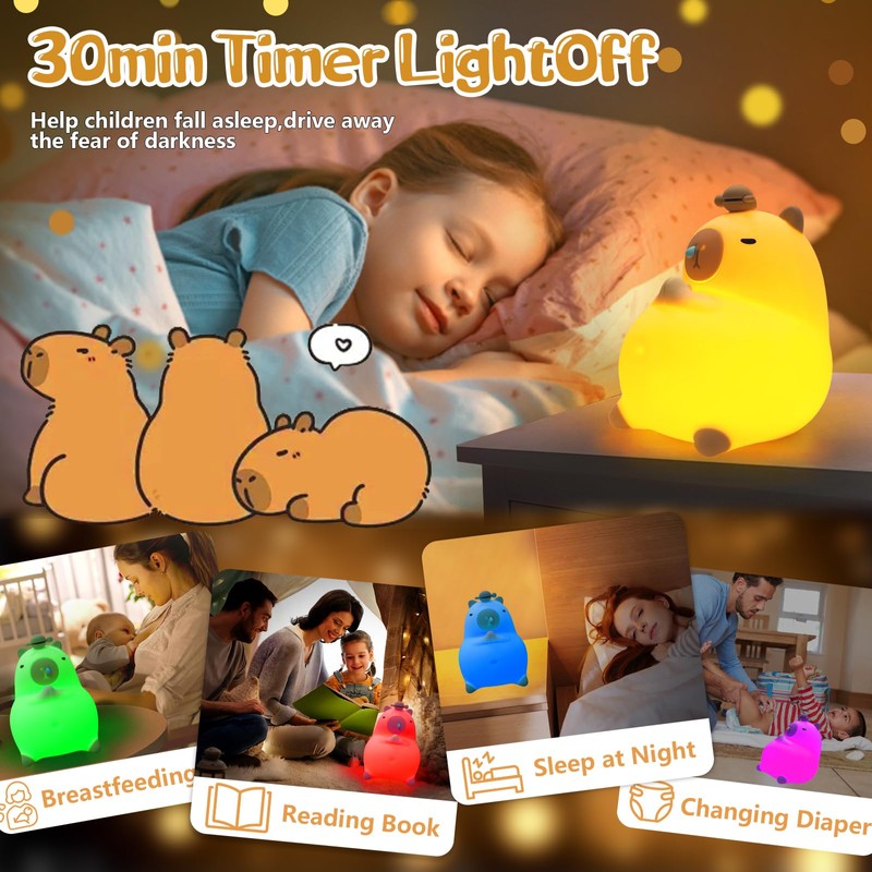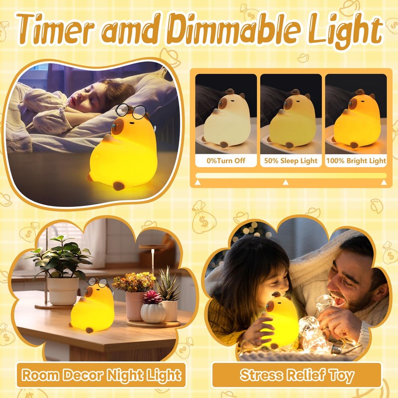- 【Cute New Addition】Elevate the style of your space with this capybara night light. In Warm mode, LED light does not hurt your child's eyes, adjustable brightness in 2 levels. Not only does it provide illumination , but it also serves as a decorative piece with its adorable capybara shape.