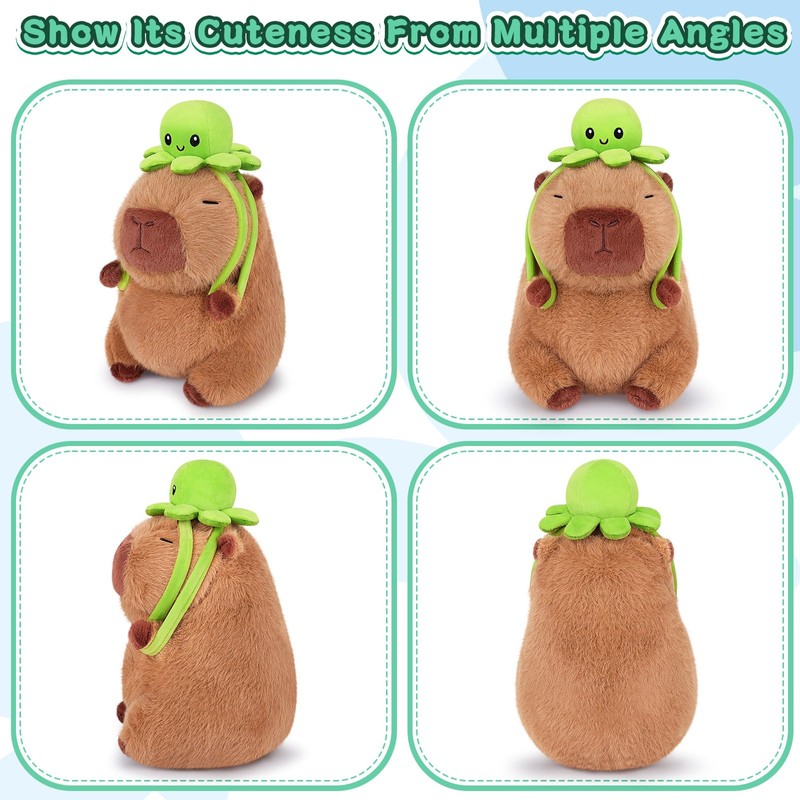 - Funny cartoon appearance -- The Capybara is carrying a tiny bag, is a black cat and octopus shaped of bag, we have the option of having the Capybara with the backpack on or off, which doesn't detract from its cuteness and fun, and it will always remain in the sitting position and fluffy long hair ( If you find that his hair is straggly, you can gently smooth it out ).