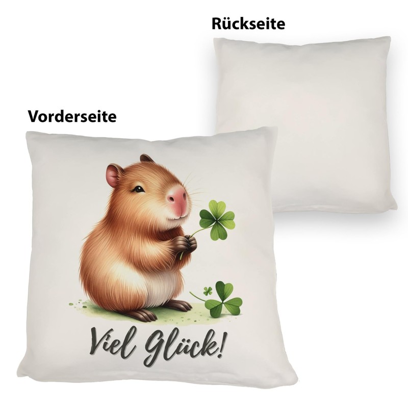 - This cushion features a cute Capybara lovingly holding a shamrock in his hand. There is also the saying 'Viel Glück!' Anytime, anywhere.