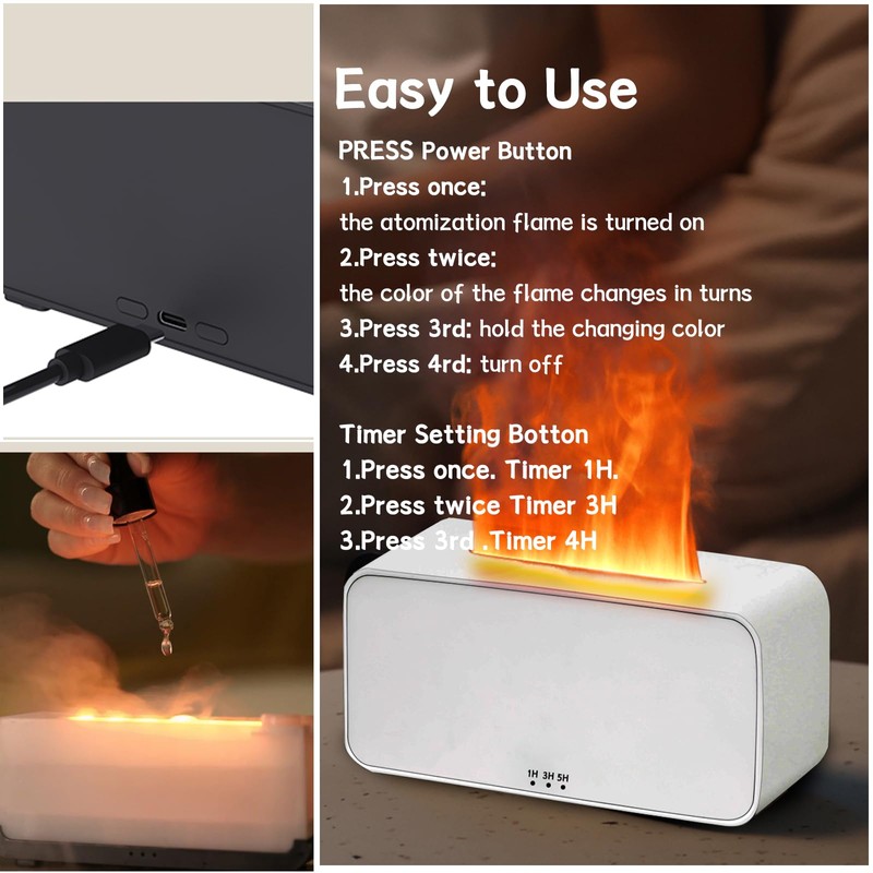 • Touch Flame Essential Oil Diffuser - Aromatherapy diffuser has 7 changeable colors touch flame fog mode, you can customize any color you like. The mini diffuser combines soothing cold fog with colored led ambience lights to produce a highly realistic flame effect emitted from the top.