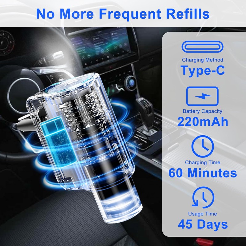 • HIGH QUALITY:The smart car air freshener is made of aluminum alloy with sandblasted surface, sturdy and durable. Built-in 220ma lithium battery 60 minutes charging, can last 45 days of battery life, long battery life, low power consumption. The perfume is extracted from natural plant extracts, safe and comfortable