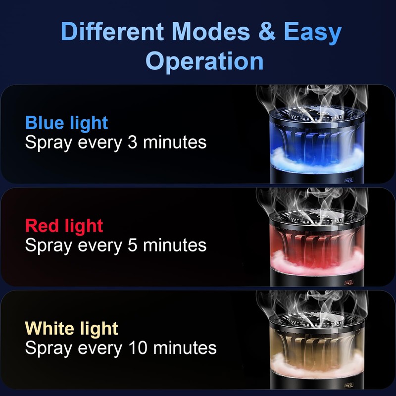 - 【MULTIPLE MODES & CONCENTRATION ADJUSTMENT】- car air freshener diffuser has 3 modes and adjustments for light, strong and continuous fragrance. Diffuser works automatically by recognizing the vibrations when the car is turned on. Blue light/spray every three minutes. Red light/spray every five minutes. White/spray every 10 minutes.