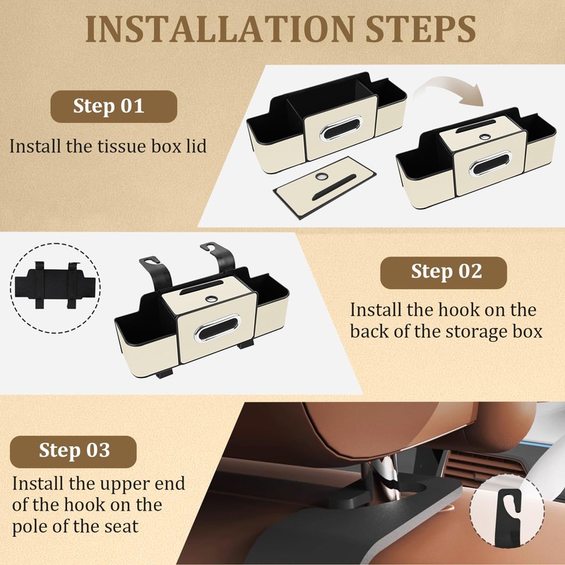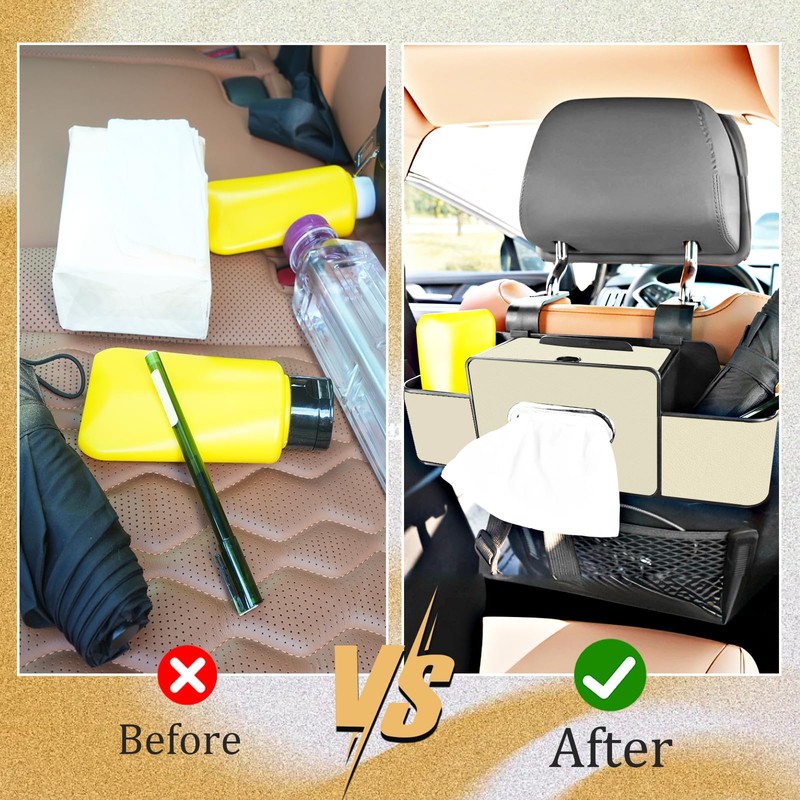 • Maximize Car Storage Space: This back seat organizer is equipped with cup holders, a tissue box compartment, and storage hooks—allowing you to easily organize drinks, tissues, and other essentials, keeping your back seat clean and clutter-free.