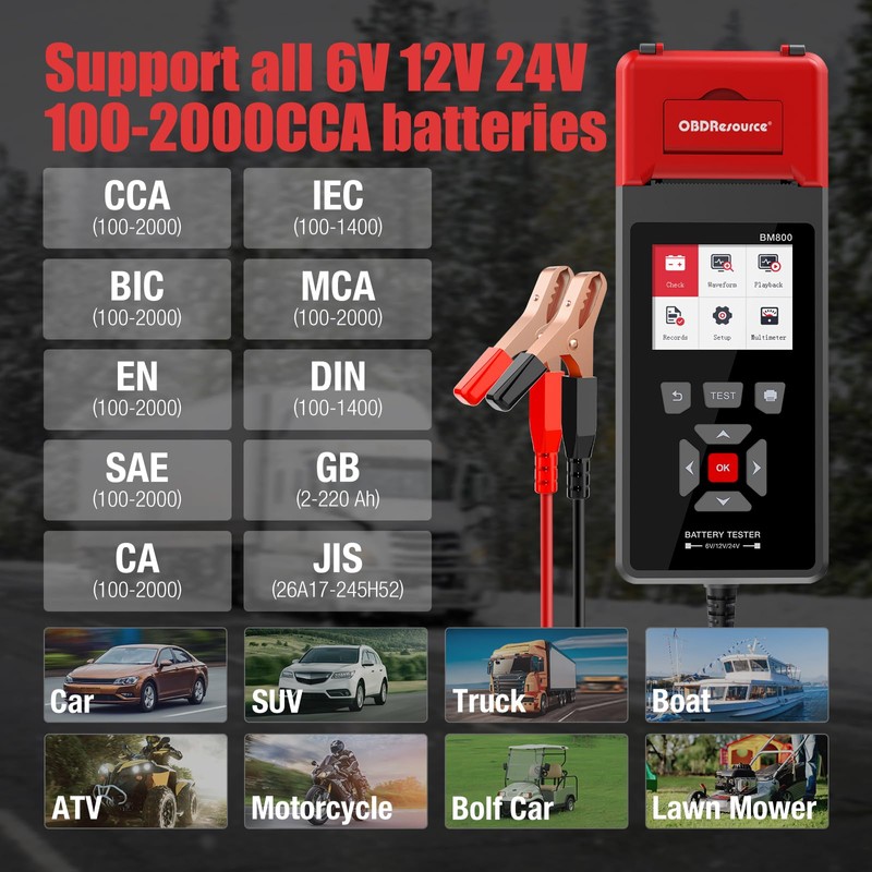 - 🔋【3-in-1 Car Battery Tester 】- Only one BM800 battery tester with printer is OK, no need another one. Equited with printer and it supports 100-2000CCA 6V 12V 24V batteries.