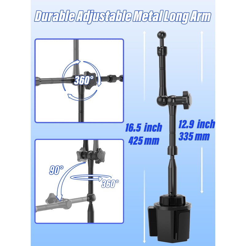 - [360 Adjustable dual metal arms]: LYFICCS Cup holder tablet mount has a total height of 16.5 inches, with two adjustable long metal arm mount, which can be locked by a knob. The metal arm can rotate 360 , providing optimal flexibility, allowing you to adjust the perfect viewing angle and height, and will not block the gear lever, ensuring your safe driving.