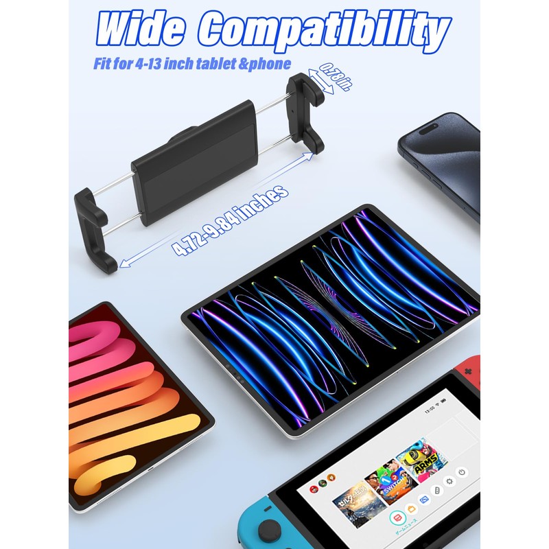 - [Widely device compatible]: The tablet cup holder has a stretch range of 4.72-9.84 inches and is compatible with 4.7-13-inch mobile phones and tablets, such as: iPad Pro 12.9/11, iPad Air 10.5/9.7, iPad 10 9 8 7, iPad Mini, Android Phone /Tablets, Switch, iPhone 16 15 14 13 12 Pro Max, Galaxy Tab, Surface, Fire HD.
