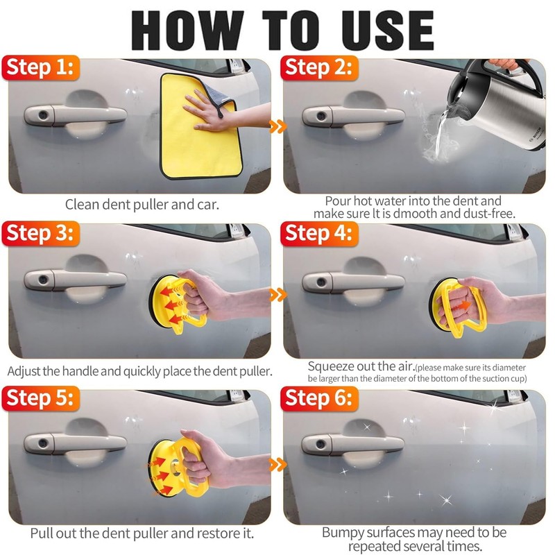 - 【Car Dent Repair Kit】 A new combination of strong suction car dent remover, you can use suction to pop the car body back into position. 2 different sizes, colors, and suction power of the car dent puller kit. Different size of the dent puller can take care different areas of car dent.