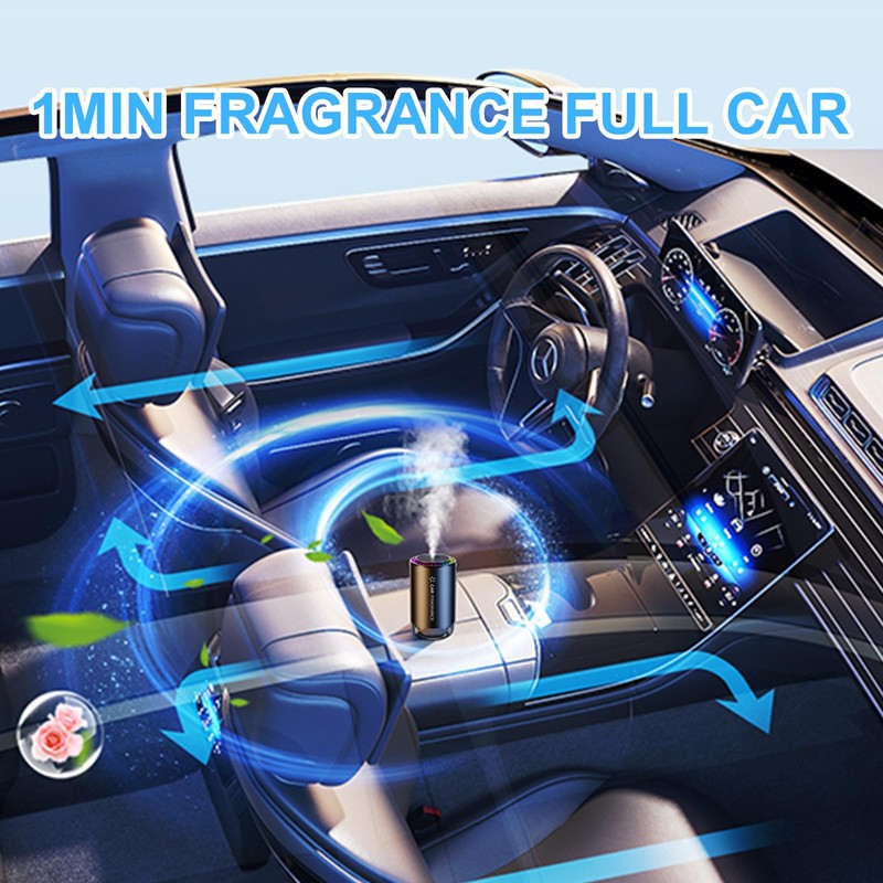 - 3 Diffuser Modes: This car air freshener diffuser has 3 spray modes: Light mode: spray every 3 minutes; Strong mode: spray every 1 minute; Home mode: cContinuous spraying. (The light on the car air freshener diffuseris will jump with the music, very ambient, 360 degree all-round scent diffusion)