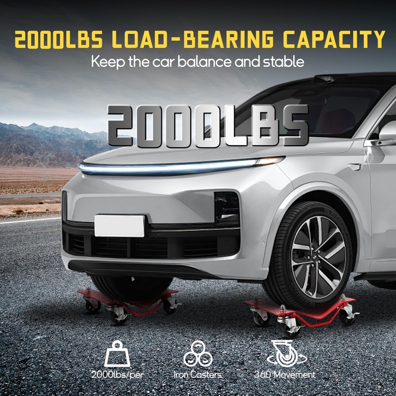 - Heavy-Duty Construction & High Capacity: 8000 LBS Total Capacity – Each of these car wheel dollies supports up to 2000 lbs with thickened steel panels, resisting bends and cracks even under extreme loads. Perfect for SUVs, trucks, and heavy vehicles.