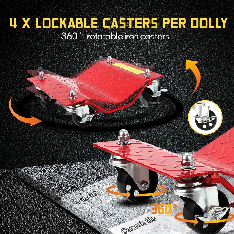 - Smooth Mobility with 3-Inch Steel Casters: 4 Heavy-Duty Rotating Wheels – Glide vehicles effortlessly with 3-inch steel casters that roll smoothly on concrete, garage floors, or workshops. Save time and effort!
