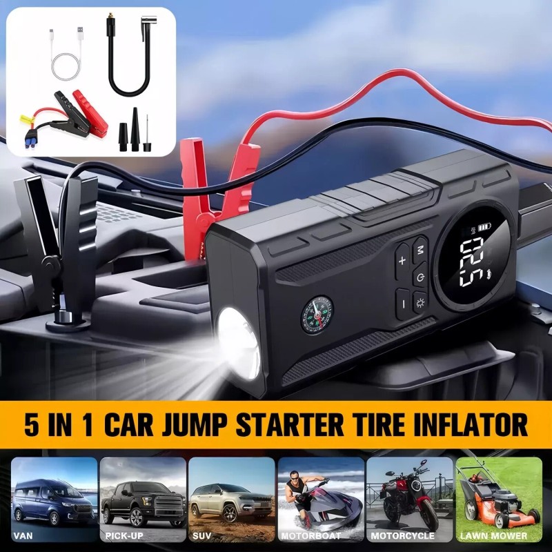- Four-in-One Functionality : Equipped with four major functions - tire inflation, vehicle starting, digital charging, and emergency lighting - providing comprehensive support for various roadside situations.