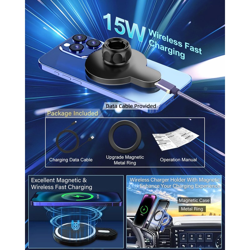- 15W QI FAST WIRELESS WITH MAGSAFE- The car phone holder charger can intelligently recognize device and support 15W high efficiency charging, immediate release and charging, intelligent alignment of magnetic suction points. Built-in smart chip to prevent overheating and overcharging and protect the battery life.We will provide charging cable for free. (Important: Ensure the single port's output of your car charger is higher than 18W / Inserting it onto the cigarette lighter)