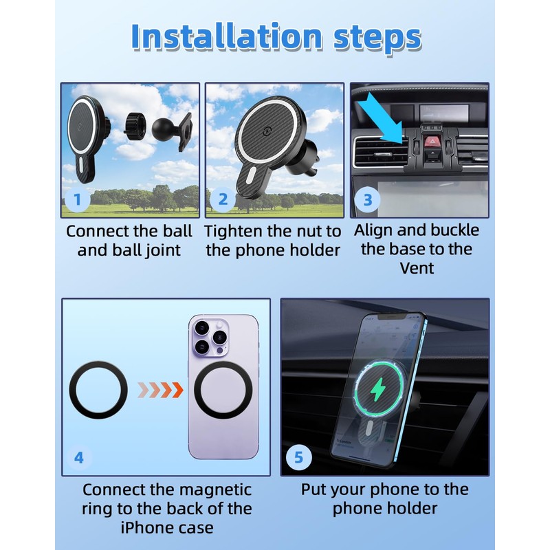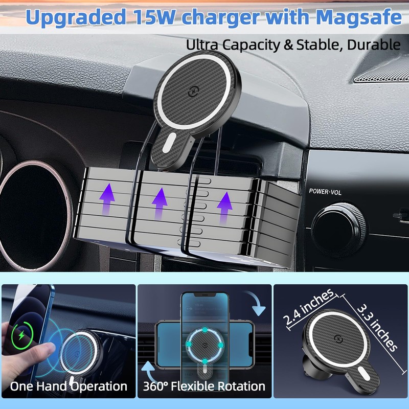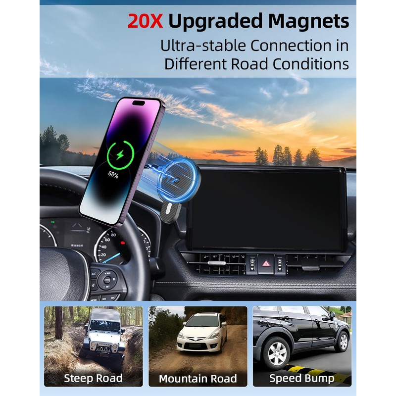 - 15W QI FAST WIRELESS CAR CHARGER- The car phone holder charger can intelligently recognize your device and charge safely. Simply place your phone on the wireless car charger holder, and it will automatically align with the charging ring, allowing you to drive comfortably while using your phone without worrying about remaining battery. We will provide you with a charging cable for free
