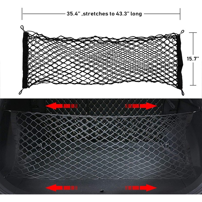 - 【Durability And Keep Tidy】The Trunk Organizers Nets Measures 35.4"x 15.7" (90cm x 40cm), It Can Stretch Till 43.3" (110cm). Made from High Quality Polyester Material to Ensure Durability and Longevity. The Storage Net, with Great Elasticity Can Hold Larger and Bulkier Objects Inside.