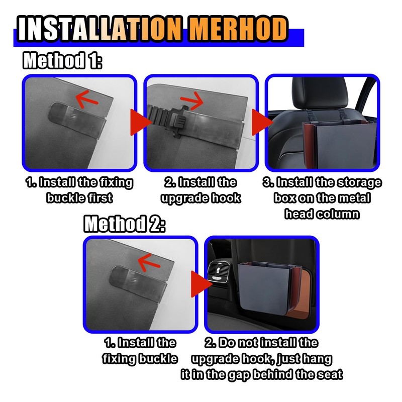- 【Effortless Installation】: The backseat car organizer employs a snap-on installation method. Fix the snap-on to the storage box and hang the hook onto it. Lastly, attach the other hook end to the car headrest. No need to remove the headrest.