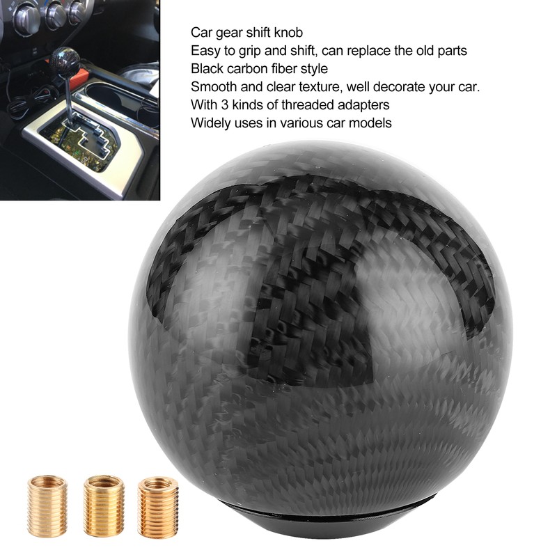 1、Car gear shift knob, round ball design, easy to grip and shift, excellent hand feeling. 2、Equipment with 3 kinds of threaded adapters, M8x1.25 / M10x1.25 / M10x1.5. 3、Black carbon fiber style, with smooth and clear texture, make car cool and fashionable. 4、Made of high‑quality carbon fiber and aluminum materials, durable and reliable in use. 5、It can directly replace the old or damaged shift knob, can be used in various models.