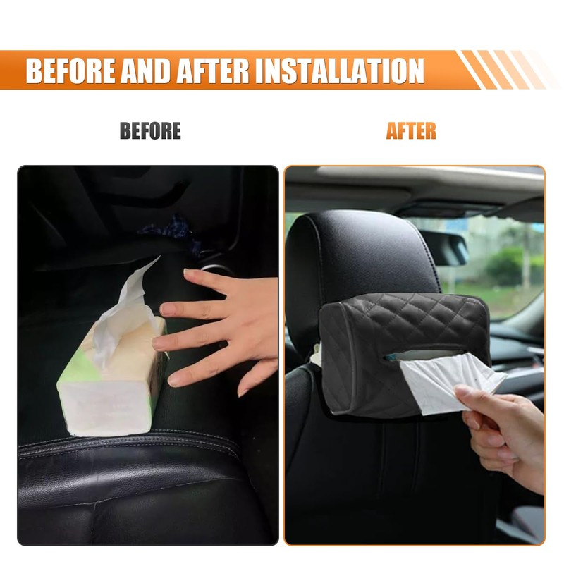 - 【Easy to Install】: The car napkin holder is easy to install, just use the high elastic clasp on the back to fix it in the desired position, and it will not come off easily after installation. You can place it in an easily accessible location in your car, such as the backrest of the car seat, behind the headrest, center console, or sun visor, so that you and your passengers can conveniently access tissues anytime and anywhere.