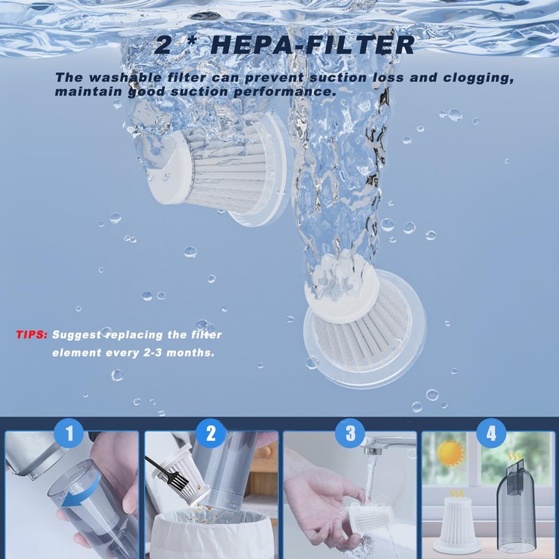 - 【Replaceable HEPA Filters & Power Indicator】The handheld car vacuum comes with 2 HEPA washable filters and a special cleaning brush, simple water wash can be used repeatedly after drying, the recommended replacement time is 2-3 months. This cordless car vacuum cleaner adopts TYPE-C charging cable, can be used anywhere there is USB slot for charging, whether in the car or at home, and you can clearly know the power level when in use through the power indicator light.