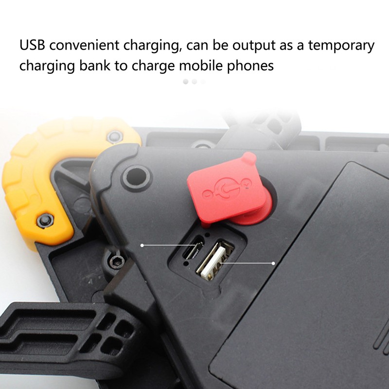 1、Super Bright and Power Saving: Hand held portable floodlight, 1500lm, using COB LED technology, instead of 200W traditional halogen bulbs, saving 80% of lighting electricity bills. 2、4 Modes: Press the switch button to turn on the charging work light, high, low, red brightness and SOS red light mode, the triangular flashing emergency LED light warns other drivers of your exist, stop it in a roadside emergency to stand it immediately rise. 3、Waterproof: This emergency warning light adopts IP65 waterproof rating to ensure that the LED work light can also work properly in rainy days. 4、Portable and Flexible: Because the LED work light is cordless and comes with a 180 degrees adjustable light base, you can place it anywhere you like, and the rechargeable floodlight hangs on a truck or is handheld, even on the ground , in the basement, in the garage or in the garden at night. 5、Battery Powered: Powered by 2 18650 rechargeable batteries (not included) or 3 AA batteries (not included), and equipped with a USB data cable (included), fast and convenient charging, also for mobile phones and other devices in emergency situations charge. 6、Wide Application: Widely used in camping, hiking, fishing, barbecue, car repair, truck, workshop, adventure, roadside succor and other outdoor activities.