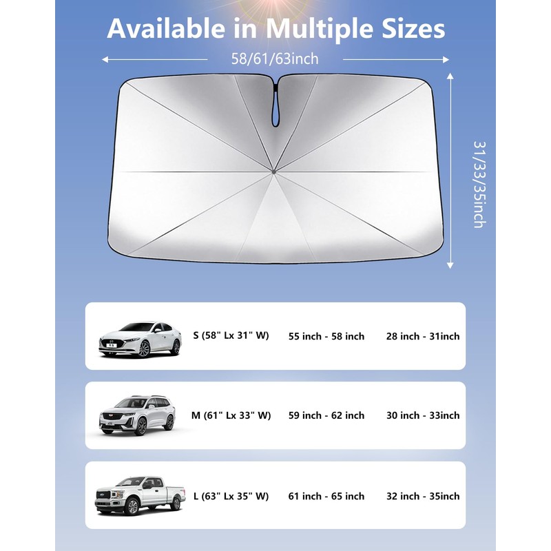 - 【Available in Multiple Sizes】 Choose from three sizes — S (58" L x 31" W), M (61" L x 33" W), and L (63" L x 35" W). Perfectly fits cars, SUVs, and trucks. Measure your windshield before ordering to ensure the best fit for optimal sun protection.