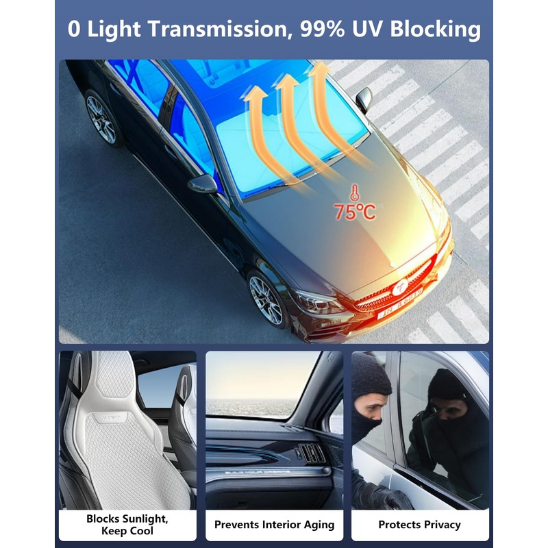 - 【5-Layer UV Protection Coating】 Made with a nano titanium silver laminate and black glue, this sunshade offers superior heat insulation and high reflectivity. Effectively blocks harmful UV rays, protecting your dashboard, leather seats, and other interiors from aging and heat damage.