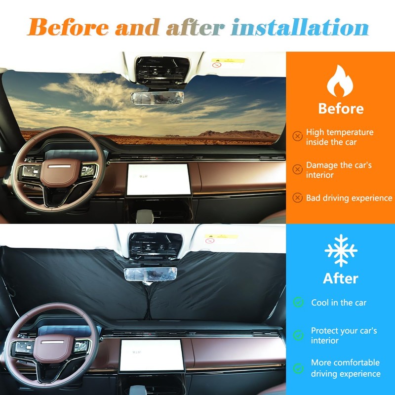 - 【Keep Vehicle Cool】 - Reflective material deflects sunlight and heat- reduce automobile internal humidity, insulation performance is good, effectively reduce the temperature inside the car, the fuel consumption saving air conditioning, helps keep car interior cool during hot & sunny weather.