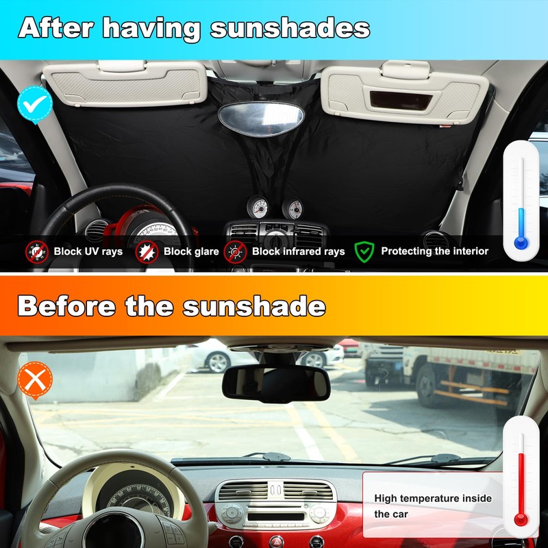 - 【Protects Your Car Interiors】:We know that the sun heat can be exhausting to you as well as to your car. Car Sun Shade for Windshield is effective against harmful UV rays from damaging your car's interior accessories. It is super durable and convenient to use.