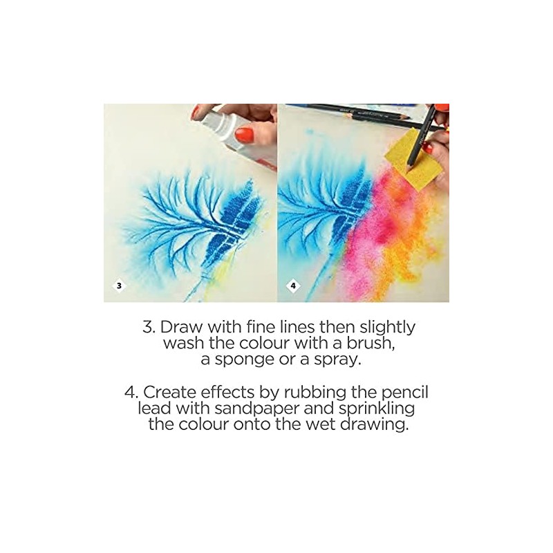 • Application techniques: Dry or wet drawing on any surface. Watercolours, lavation, hatching, shading. For precise strokes, glaze or blurred effects.