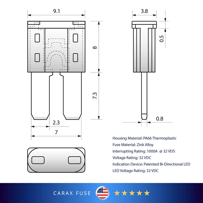 - OEM INDUSTRY STANDARD: color coding. Size complies OEM standard SAEJ2741, UL, EU RoHS, REACH. Bright diode inside the fuse. Suitable for Car, Auto, Motorcycle, Truck, SUV, Boat, Marine, RV.