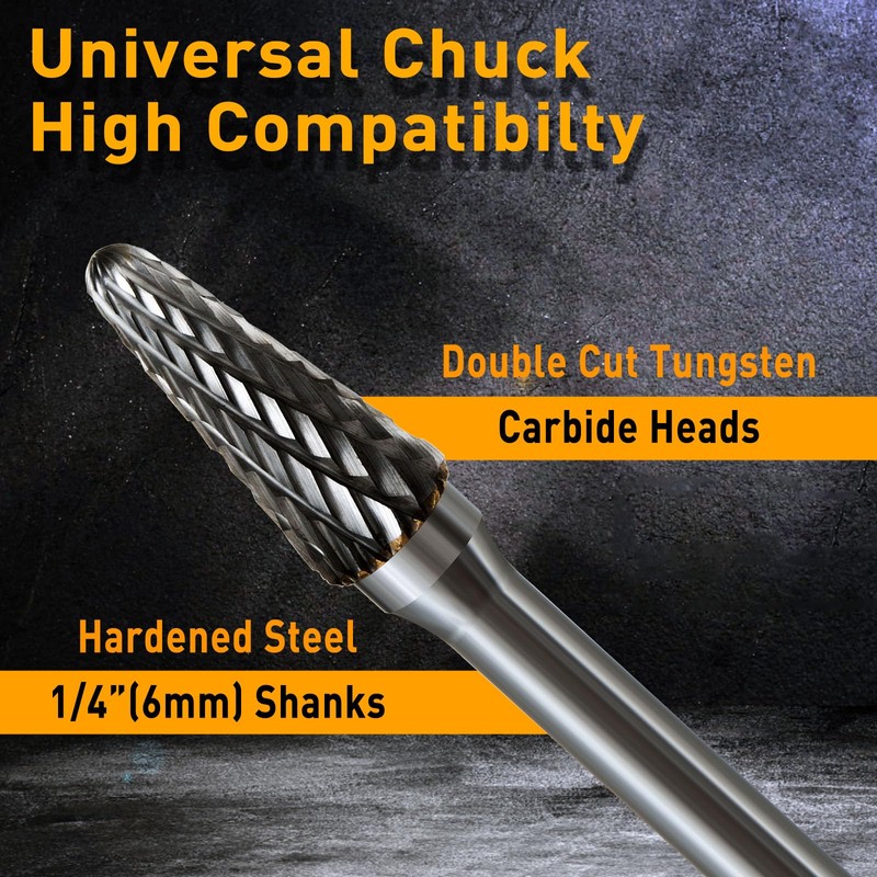 - A Must-Have: The tungsten carbide burrs set 1/4 shank is a great variety of shape. Package Includes: 10 PCS 1/4" shank carbide burr bits, 1 ten-slots inner plastic clamshell box, 1 outer plastic double buckle clamshell box, 1 ten-slots beech holder
