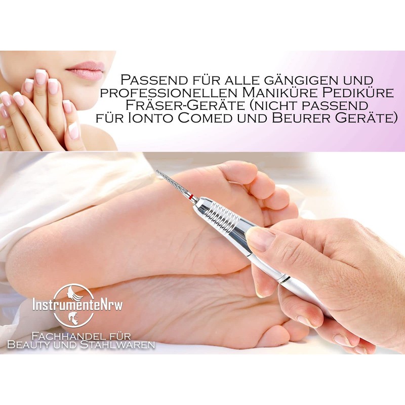 Ideal aid for manicure, pedicure, nail care at home, here the InstrumenteNrw carbide cutters will help you. InstrumenteNrw HM sanders are manufactured to meet high demands and allow for clean professional work. They can contribute to well-groomed beautiful hands and feet. Suitable for all standard and professional router devices (not suitable for Ionto Comed and Beurer devices). The HM cutter has the following details:
