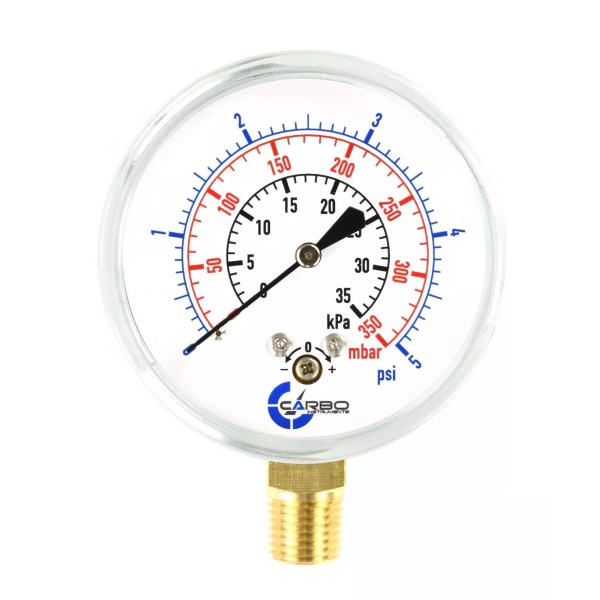CARBO INSTRUMENTS 2-1/2" Capsule Diaphragm Pressure Gauge 5 PSI 1/4" NPT Low Mnt, Adjustable Zero
