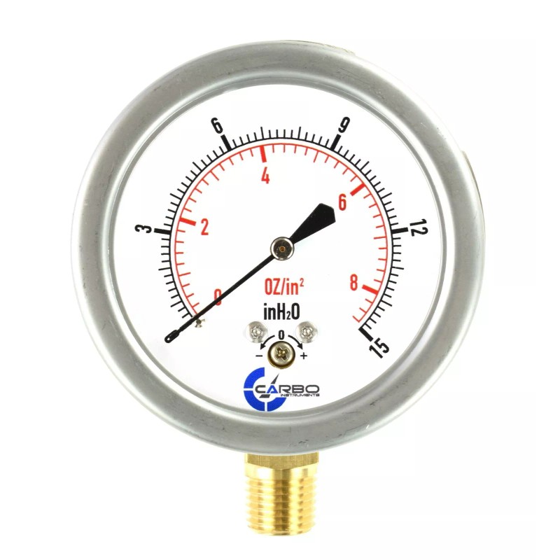 CARBO INSTRUMENTS 2-1/2" Capsule Gauge 0-8oz/0-15in H2O Range 1/4" NPT Low Mnt, Adjustable Zero