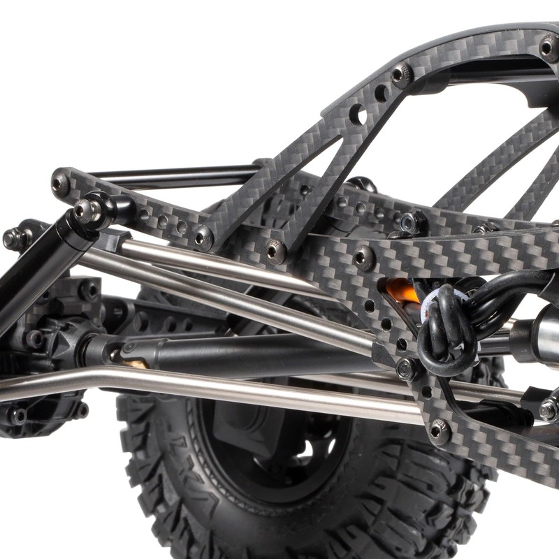 - Lightweight and durable carbon fiber frame kit and electronics tray, machined solid delrin skid, 3D printed cover hat. With optional titanium links and driveshaft set